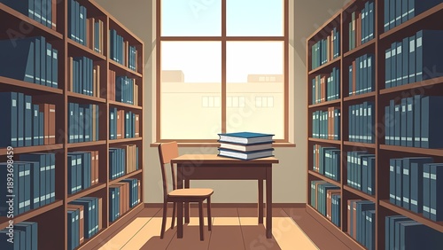 library, book, bookshelf, shelf, interior, study, desk, chair, window, sunlight, warm, cosy, learning, education, quiet, academic, cognition, reading, literacy, ambience, daylight, room, bookshelf, stack, stack, scene, illustration, morning, sunbeam, glow