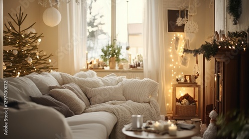 christmas, living room, cosy, sofa, pillow, blanket, christmas tree, light, fireplace, candle, winter, holiday, home decor, festive, serene, rustic, comfortable, inviting, textured, soft, warm, holiday season