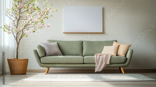 living, room, sofa, green, pillow, plant, cosy, modern, decor, interior, furniture, minimalist, wall, art, natural, light, textile, home, comfortable, stylish, basket, throw, blanket, bright, relaxing, contemporary, design, space, aesthetic, seating, arrangement, soft, wooden, floor, spring