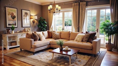 Cozy living room with a neutral color palette, plush sofa, and natural light streaming in