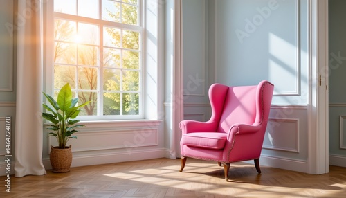 armchair, pink, living room, home decor, natural light, sunlight, indoor plant, window, wooden floor, cosy, furniture, interior design, relaxation, comfort, elegant, modern style, home, bright, roomy, serene, stylish, decorative, calmness, lifestyle, decor, inviting, design, peaceful, warm tones, leisure, charme, pure, simplicity, ambience