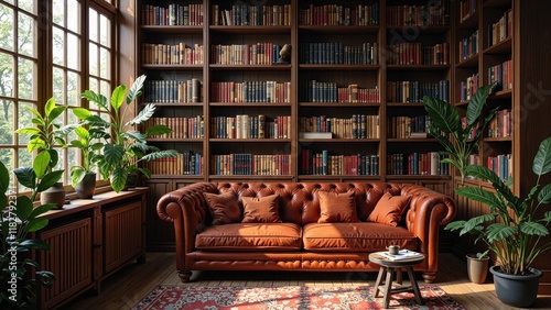 Cozy living room with vibrant flair, featuring a sleek orange leather sofa beneath a rich brown bookcase, accented by a bold red & blue floral rug under warm sunlight streaming through the left window