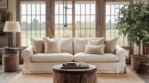 Cozy living room with white sofa and rustic decor near large windows overlooking nature