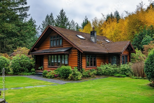 log cabin, house, home, residential, architecture, real estate, wood, cabin, nature, landscaping, greenery, tree, grass, lawn, autumn, fall, leaf, exterior, building, property, bungalow, rustic, peaceful, serene