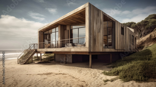 beach, house, modern, villa, architecture, sea, luxury, scandinavian, beautiful, building, concept, contemporary, cosy, design, exclusive, expensive, exterior, holiday, home, illustration, landscape, new, private, property, relax, residential, resort, sand, secluded, style, stylish, summer, tour, tour tourism, travel, vacation, weekend, sunset, dusk, wooden, wood, generative, ai, construction, sky, roof, structure, window, estate