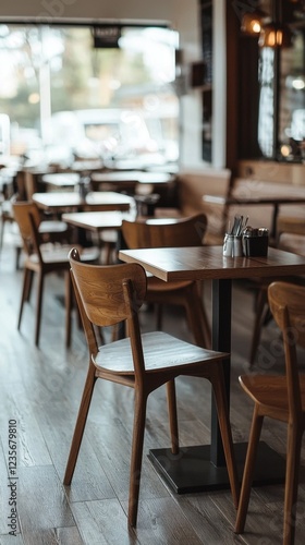 Cozy Modern Cafe Interior with Wooden Chairs and Natural Light