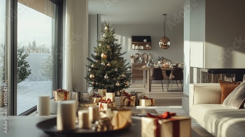 cosy, modern, home, design, open, plan, interior, decor, christmas, tree, gift, celebration, festive, warm, living, room, natural, light, furniture, table, seasonal, holiday, decoration, relaxing, inviting, scene, stylish, ambience, atmosphere, contemporary, aesthetic, comfort, simplicity, elegance, nature, view, tone, serene, arrangement, gathering, family, space, chic, artistry, beauty