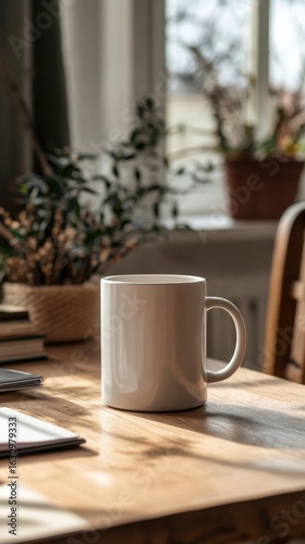 Cozy Morning Scene with White Coffee Mug and Natural Light