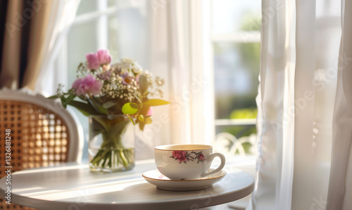 Cozy morning tea by the window with a vintage floral cup and a bouquet of fresh flowers on a white wooden table, bathed in soft natural sunlight