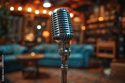 Cozy Recording Studio with Vintage Microphone Warm Lighting and Plush Sofa Background