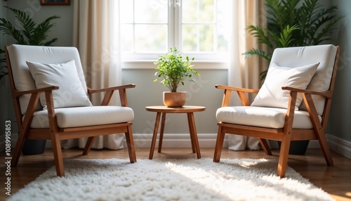 Cozy sitting area with wooden armchairs, soft cushions, round wooden table, potted green plant, fluffy rug, and natural sunlight