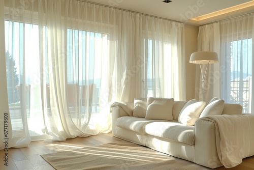 interior, home, design, decor, living room, sunlit, curtain, sofa, couch, comfortable, cosy, bright, natural light, relaxation, modern, stylish, elegant, minimalistic, white, lamp, floor lamp, window, sunlight, airy, roomy, contemporary, interior design, homely, soft, serene, peaceful, calmness, fabric, living space, domestic, furniture, chic, interior decoration, ambient, beautiful, inviting, clean, fresh, morning light