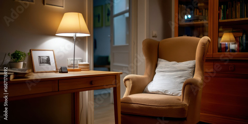 armchair, pillow, wooden, desk, lamp, bookshelf, cosy, warm, living, room, comfortable, home, interior, reading, nook, soft, lighting, furniture, relaxation, cushion, striped, wood, indoor, plant, framed, photo, ambient, light, quiet, space, decor, peaceful, inviting, classic, style