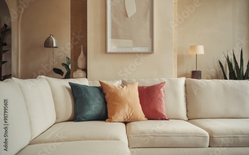 Cozy white corner sofa with multicolored pillows near beige wall with art frame. Minimalist interior design of modern living room.