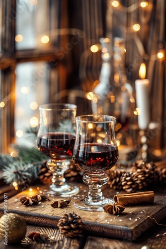 Cozy Winter Scene: Mulled Wine with Holiday Decor, Cinnamon Sticks, Pinecones, and Warm Lighting