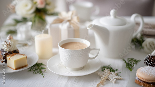 afternoon tea, beverage, cake, candle, celebration, cheesecake, christmas, closeup, comfort, cosy, cup, decor, decoration, delicious, dessert, drink, elegant, event, festive, food, gathering, gift, epicure, holiday, home, indulgence, interior, luxurious, new year, pastry, porcelain, present, relaxing, saucer, special occasion, still life, sweet, table setting, tea-party, teacup, teapot, treat, warm, white, winter