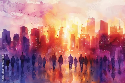 craft, compelling, visual, bustle, city landscape, diverse, individual, silhouette, sunset, symbolize, group, lifestyle, public, people, disease, set, wellness, urban, render, poignant, silent, city, skyline, brushstroke, impact