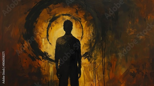 Craft a dramatic scene with a high-angle view of a stylized man, his silhouette mirroring an intricate symbol, rendered in bold acrylic strokes