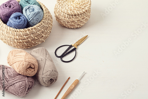 Craft hobby background with yarn in natural colors. Recomforting hobby to reduce stress for cold fall and winter weather. Mock up, copy space, top view