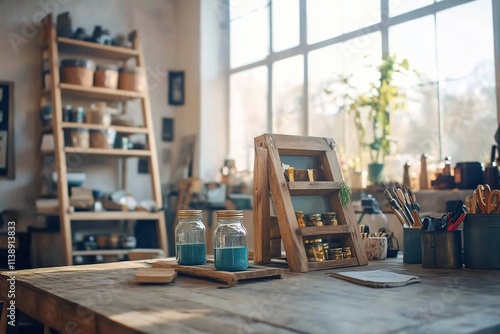 workshop, craft, table, wood, paint, jar, supply, studio, art, bricolage, hand-made, creative, design, artist, small business, workspace, interior, window, light, shelf, tool, brush, pot, container, material, equipment, organisation, storage, rustic, cosy, natural, simple, hobby, passion, skill, work, creation, inspiration, maker, artisan, craftsmanship, homemade, product, selling, display, retail, shop, store