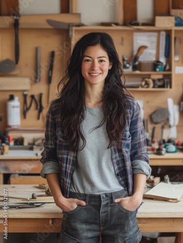 craftsman, woman, workshop, carpenter's shop, tool, saw, hammer, chisel, plane, drill, press, vice, grip, safety, goggles, measuring, tape, crayons, screwdriver, bench, pride, craftsmanship, expertise, artisanal, work, creative, workspace, bricolage, project, handcraft, object, making, process, wooden, item, organisation, professionalism, confidence, efficient, skilled