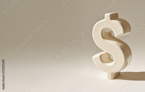 cream ceramic $ dollar sign painted sculpture isolated on plain light studio background, frame template with blank copy text space