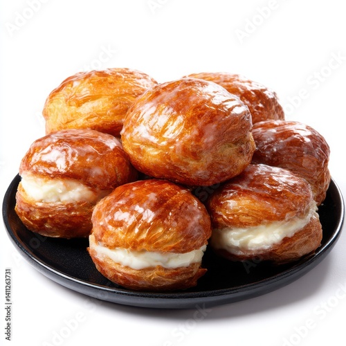 cotton balls, cream, pastry, sweet, food, dessert, plate, baked, glaze, stack, bun, bakery, delicious, sugar, snack, treat, gold, brown, round, filling, cake, epicure, fresh, tasty, dish, cookery, confection, lunch, dinner, white, background, glazed, puff, displayed, pastry
