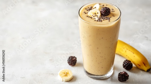 Creamy banana smoothie with blackberries and chia seeds on a light background