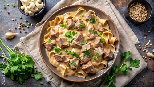 beef stew, noodle, parsley, garlic, peppercorn, food photography, dish, meal, dinner, comfort food, home cooking, delicious, tasty, savoury, hearty, rustic, kitchen, food, epicure, gastronomy, culinary, receipe