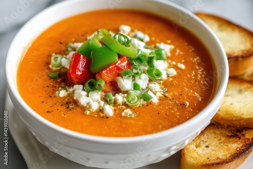Creamy bell pepper and tomato soup topped with goat cheese green onions and pepper