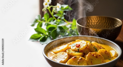 Creamy Bhutanese Kewa Datshi – Potatoes in Yak Cheese Sauce, Ceramic Bowl with Potato Vine & Bronze Bowl