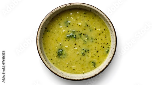 Creamy broccoli cheddar soup in rustic bowl on white background
