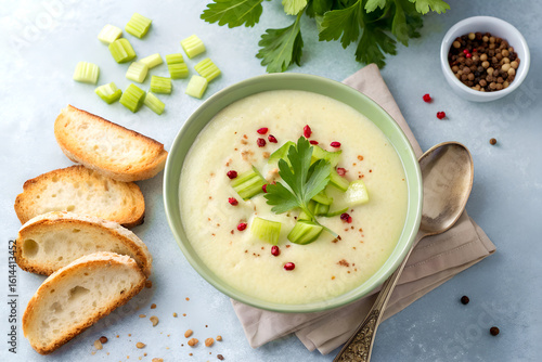 celery, soup, creamy, fresh, leaf, pink, pepper, crispy, toast, light, grey, background, top, view, elegant, epicure, healthy, vegetarian, warm, comforting, smooth, aromatic, delicate, refined, homemade, lunch, dinner, bowl, garnished, stylish, modern, simple, alimentary, flavorful, appetising, soothing, balanced, textured, seasonal, autumn, winter, nourishing, rich, delicious, minimal, aesthetic, steamy, soft