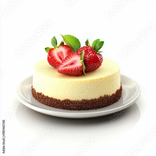 Creamy Cheesecake with Strawberry Topping on a White Plate and Glossy Background
