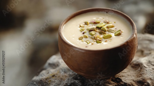 Creamy Dessert in Rustic Bowl, Topped with Pistachios