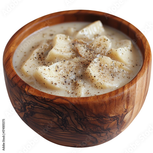 dumpling, soup, wooden, bowl, creamy, pepper, garnish, food, cookery, delicious, meal, hearty, comfort, savoury, traditional, homemade, culinary, dinner, lunchtime, white, background, isolated, close, up, style, aromatic, spice, cooking, dish, lunch, tasty, nourishment, studio, presentation, eat, simple, ingredient, preparation, receipe, epicure
