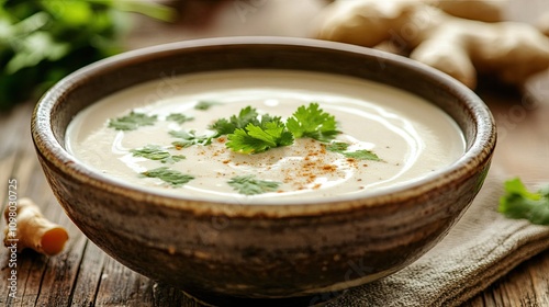 soup, creamy, ginger, cilantro, bowl, food, cookery, dish, meal, healthy, delicious, tasty, dinner, lunch, vegan, vegetarian, spicey, aromatic, favor, fresh, organic, natural, ingredient, receipe, cooking, culinary, eatery, homemade, comfort, warm, smooth, texture, garnish, spice, root, herb, plant, brown, beige