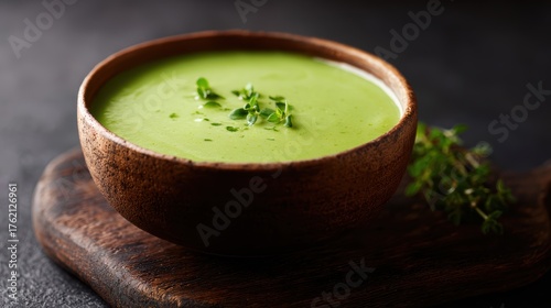 Creamy green pea soup in rustic bowl, garnished with herbs, plant-based diet concept.