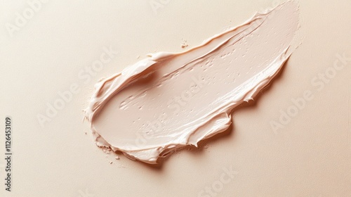 Creamy makeup swatch on a soft beige background, displaying a smooth texture and natural tone, ideal for beauty products, cosmetics, skin care, makeup artistry.