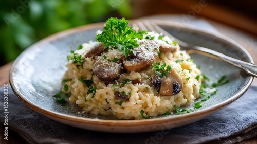 Creamy Mushroom Risotto Garnished with Parsley and Parmesan
