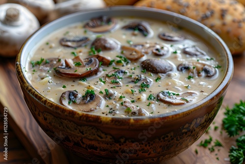 mushroom, soup, creamy, herb, rustic, bowl, dining, culinary, cosy, artisan, bread, texture, rich, fresh, garnish, favor, wholesome, delicious, comforting, autumn, winter, meal, epicure, homemade, lunch, dinner, receipe, kitchen, cookery, warm, inviting, aromatic, food, organic, healthy, nourishment, soothing, taste, satisfy, natural
