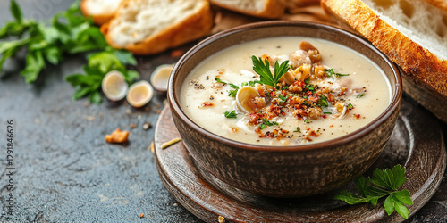 Creamy mushroom soup with bread, parsley, and spice garnish. A comforting and flavorful dish for any time of year, served in a rustic bowl.