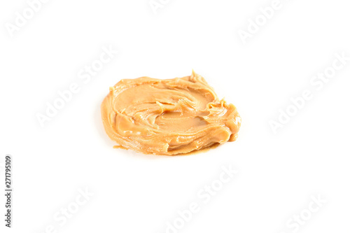 Creamy peanut butter isolated on white background. A traditional product of American cuisine