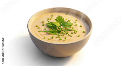 Creamy Potato Soup Recipe: Comfort Food Garnished with Fresh Herbs Gourmet Creamy Soup Bowl: Perfect for Winter Warmth Appetizing Yellow Cream Soup with Chives and Parsley Garnish