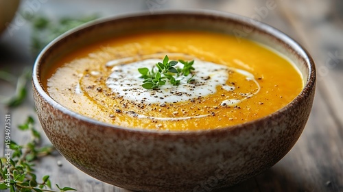 pumpkin soup, herb, wooden table, garnish, spice, vegetarian, warm colors, food photography, soup, thyme, black pepper, comfort food