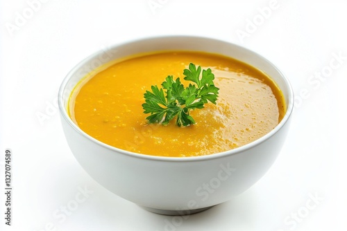 Creamy pumpkin soup in a white bowl with fresh parsley garnish on a white background food photography