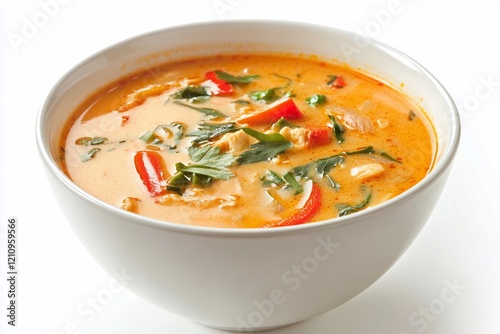 Creamy red curry soup in a white bowl with chicken, bell peppers, and herbs.