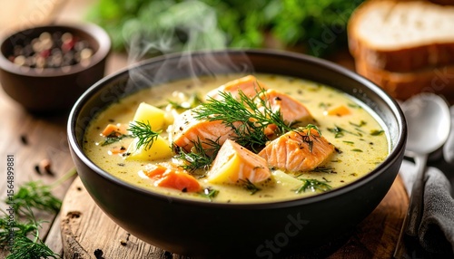 Creamy salmon soup with potatoes, dill, and vegetables in a steaming bowl