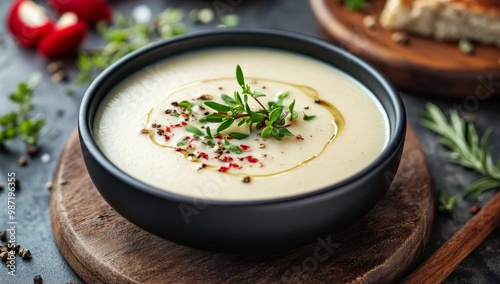 soup, creamy, white, bowl, black, herb, thyme, garnish, pepper, olive, oil, red, flake, savoury, rustic, delicious, food, meal, lunch, dinner, homemade, fresh, healthy, flavorful, aromatic, spicey, tasty, cookery