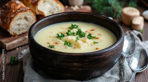soup, creamy, bowl, herb, rustic, bread, food, meal, parsley, crouton, cookery, garnish, lunch, wooden, table, spoon, napkin, homemade, cosy, comfort, dairy, dinner, dish, healthy, traditional, warm, serving, epicure, texture, tabletop, fabric, crust, slice, pottery, nourishment, culinary, elegance, flatware, ingredient, pattern, style, dining, image, copy space